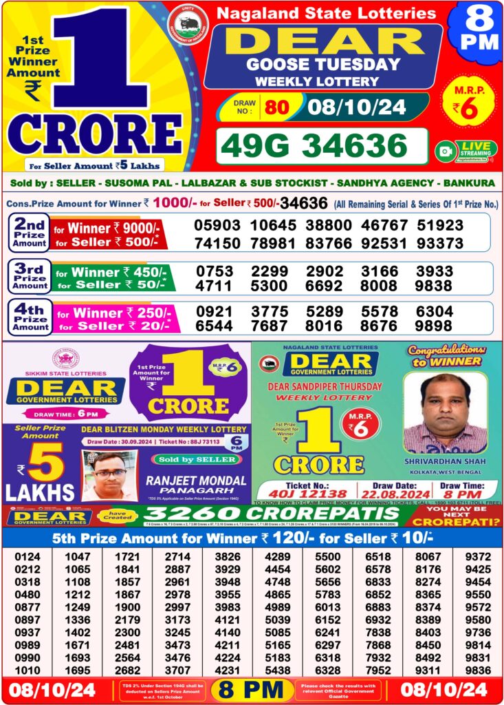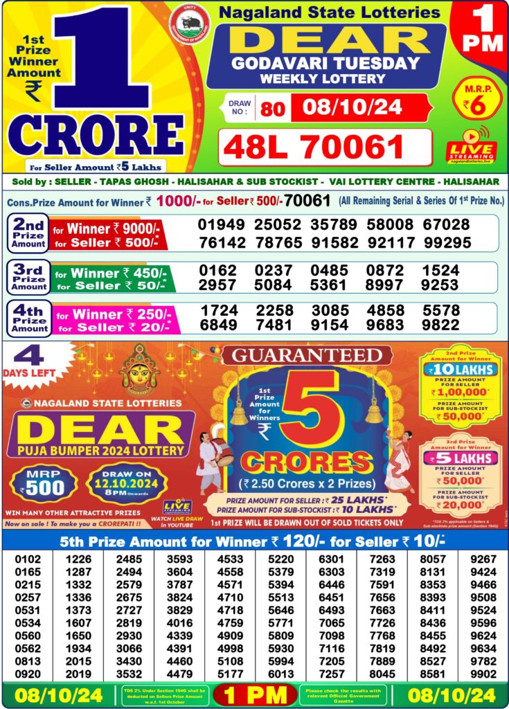 The Nagaland State Lottery results for today, October 08, 2024, will be declared soon! The fortunate winners of the Nagaland State Lottery DEAR GODAVARI MORNING 1 PM, DEAR WAVE EVENING 6 PM, and DEAR GOOSE NIGHT 8 PM have been revealed, offering a chance to win a whopping Bumper Prize of Rs. 1 Crore.