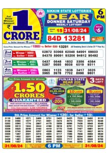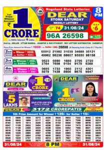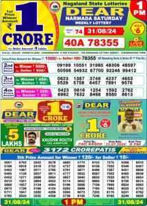 The Nagaland State Lottery results for today– August 31, 2024, are declared soon! The fortunate winners of the Nagaland State Lottery DEAR NARMADA MORNING 1 PM, DEAR RIVER EVENING 6 PM and DEAR STORK NIGHT 8 PM have been revealed offering a chance to win a whopping Bumper Prize of Rs. 1 Crore.